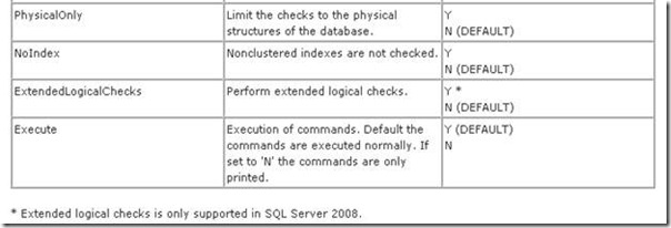 My first step was to run Ola’s DatabaseIntegrityCheck.sql script. But before I did, I checked to see what default settings he used to perform the database integrity checks. The available options are show below: