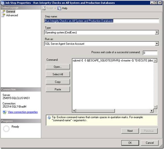 Notice, that when I run this step as part of a larger, single job, that it is run as a CmdExec job type, and that the stored procedure actually runs from SQLCMD. Since you can’t see all of the code above, here is what it looks like:
