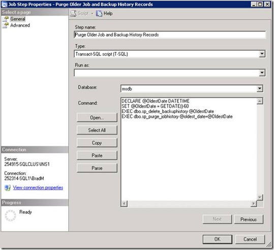 Unlike the first two job steps, this step uses the T-SQL job type and runs several lines of code against the msdb database. All the script does is to subtract 60 days from today’s date, and then uses this date as the cutoff date to remove older job and backup history using the sp_delete_backuphistory and the sp_purge_jobhistory system stored procedures.