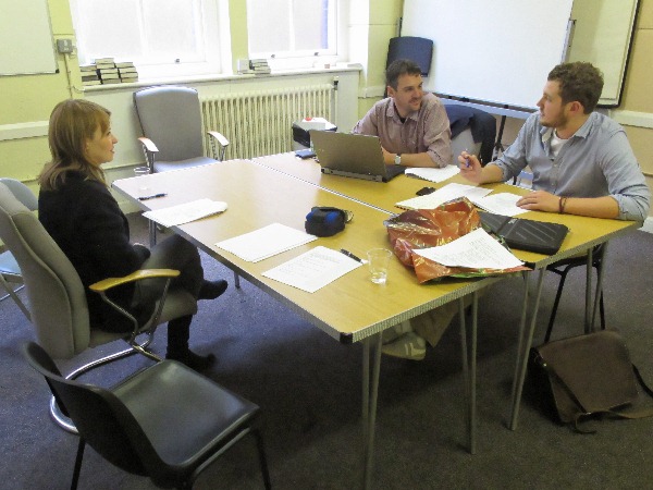 From left to right: Read trough with Nell Mooney (Miss Friday), Haydn (Senior Creative), and Will (Director). I am taking the photo.