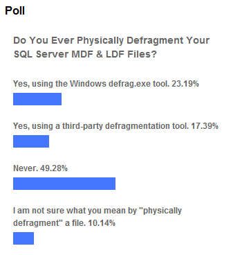 Most of the time when I run a poll on my blog, I run it for at least a month so that I can get enough results in order for the data to be more or less representative of the SQL Server community. What has been odd about this poll, is that even though I have run it longer than any other poll on the website, it has had one of the fewest response rates.